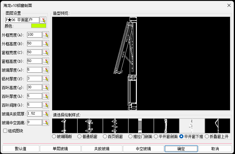 海龙V10独有的铝窗剖面,可以生成铝制的玻璃隔断,常规铝窗,百页窗,推拉门剖面,平开窗剖面和平开窗外推剖面,非常强大;除此之外,类似关于玻璃造型框,也可一键生成。2026.04月即将推出新版功能