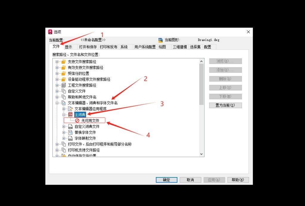 1、打开CAD,输入OP,回车,打开选项对话框,在文件选项卡中检查朱词典是否为无可用文件,如下图所示。