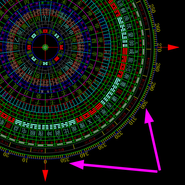 180, 200…360是罗盘上最重要的一圈长串数字,称之周天度数;一个圆周是360度,罗盘将其进一步细分为3840等份;在风水中,不同的方位对应着不同的吉凶含义。风水师通过罗盘测量出精确的坐向(如“子山午向”),然后结合周天度数,来判断这个方位属于哪种“分金”,是吉利、凶险还是空亡,从而为布局提供依据
