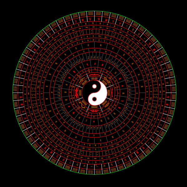 更外层的圈包含了代表吉凶的“九星”(如贪狼、巨门)、象征命运的“七十二龙”、以及用于择日的“二十八星宿”等复杂系统