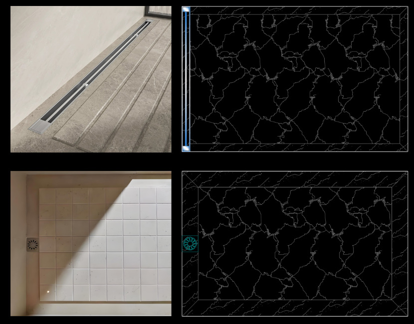 地漏表达了与瓷砖的衔接关系(如“回字形”切割、对角线切割),指导瓦工铺贴,上面预留的坡度明确角度和额方向箭头需要指向地漏,整个湿区地面的排水坡度(国标一般为1%-2%,即每米降低1-2厘米)