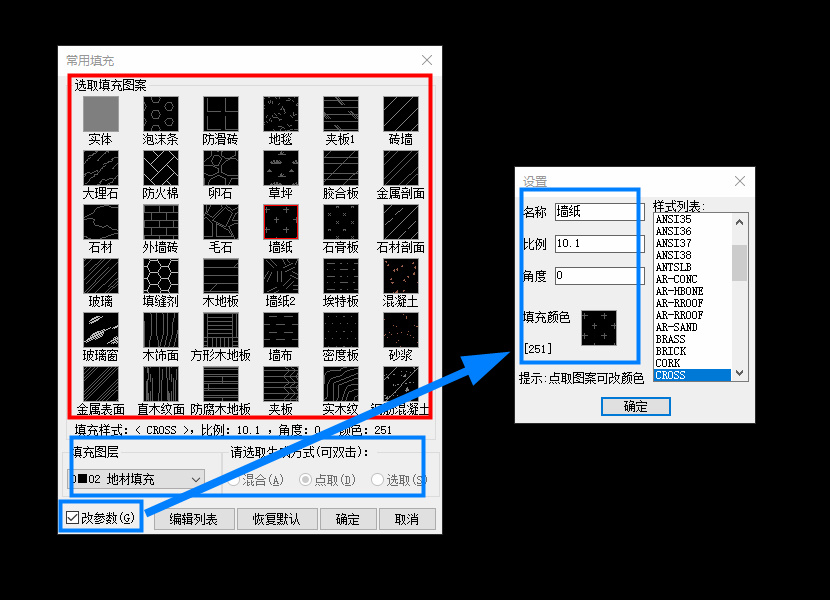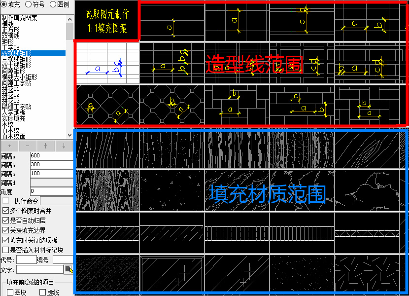 造型线+填充:海龙最强大的智能地面材质绘图系统。可以直接生成地面材质的“造型分隔”、“材料标记块”,还有“地面起铺点”,为后续的“智能铺装PZ”和“一键平立面TTT”高效生成提供坚实的基础