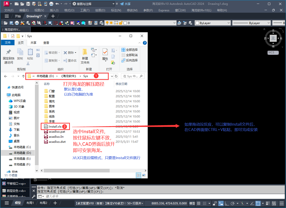 可以用其他方法安装,打开海龙文件夹,找到install文件,把他拖到cad界面完成安装