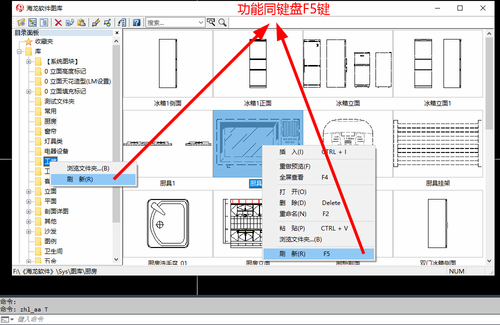 对着文件夹和图块右键,均可以出现“刷新”选项,此功能和F5是同步的,当我们在源文件删除了部分文件,按下F5即可刷新同步最新状态
