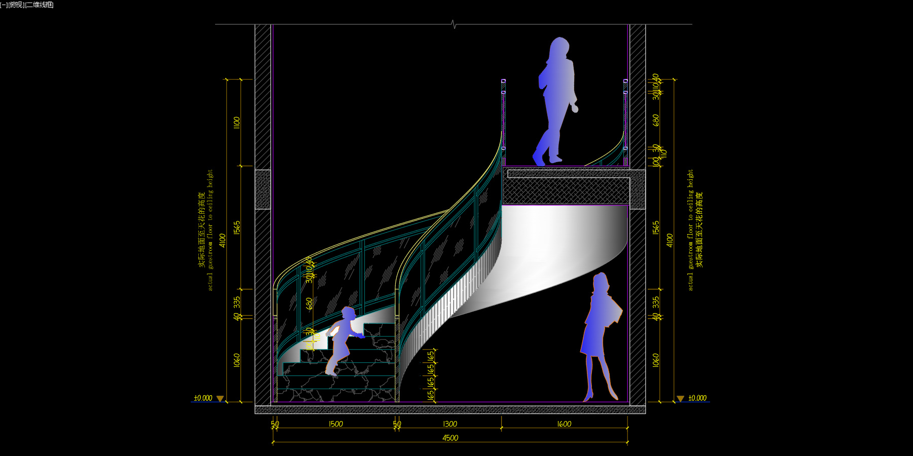 弧形楼梯转立体在位编辑 “ 空格→E楼梯填充细化,TC/ZB标注断开DB增加人物投影AA插入填充TC图块裁剪XC
