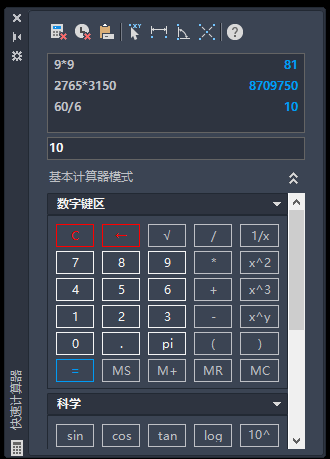海龙计算器JSQ,输入命令跳出面板可放置在侧栏,可以输入尺寸导入数据,也可以输入尺寸进行计算,计算出来的数据记录可以保留