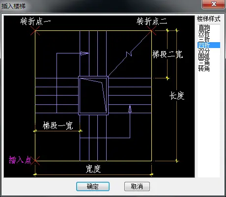 v点取双分楼梯的定位点。v点取双分楼梯长度方向的平台端点。v点取双分楼梯宽度方向的平台另一端点。v自动设置较为合理的楼梯参数。