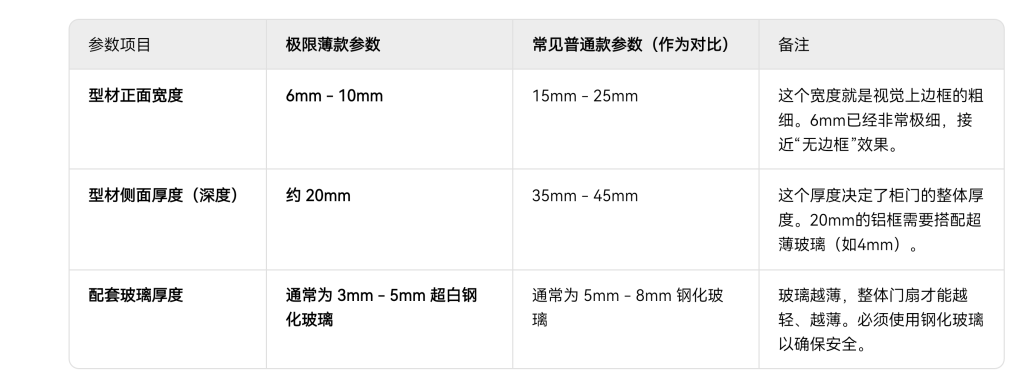 那么,市面上一套极限薄的铝框玻璃门,可能是由宽度5mm,深度20mm的铝型材,搭配 3~5mm厚的超白钢化玻璃组成,需注意: